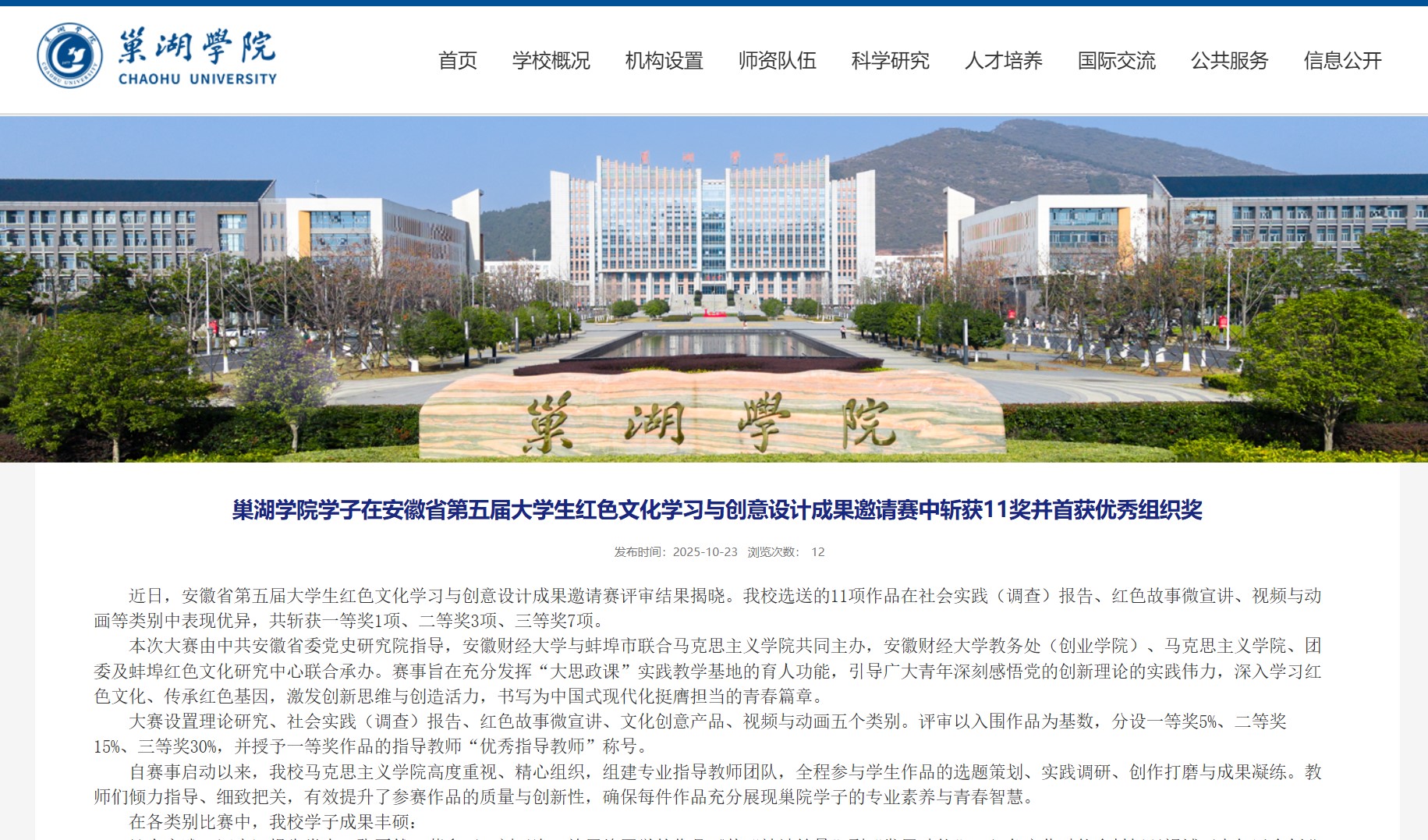 • 巢湖學院在安徽省第五屆大學生紅色文化學習與創意設計成果邀請賽中斬獲11獎并首獲優秀組織獎