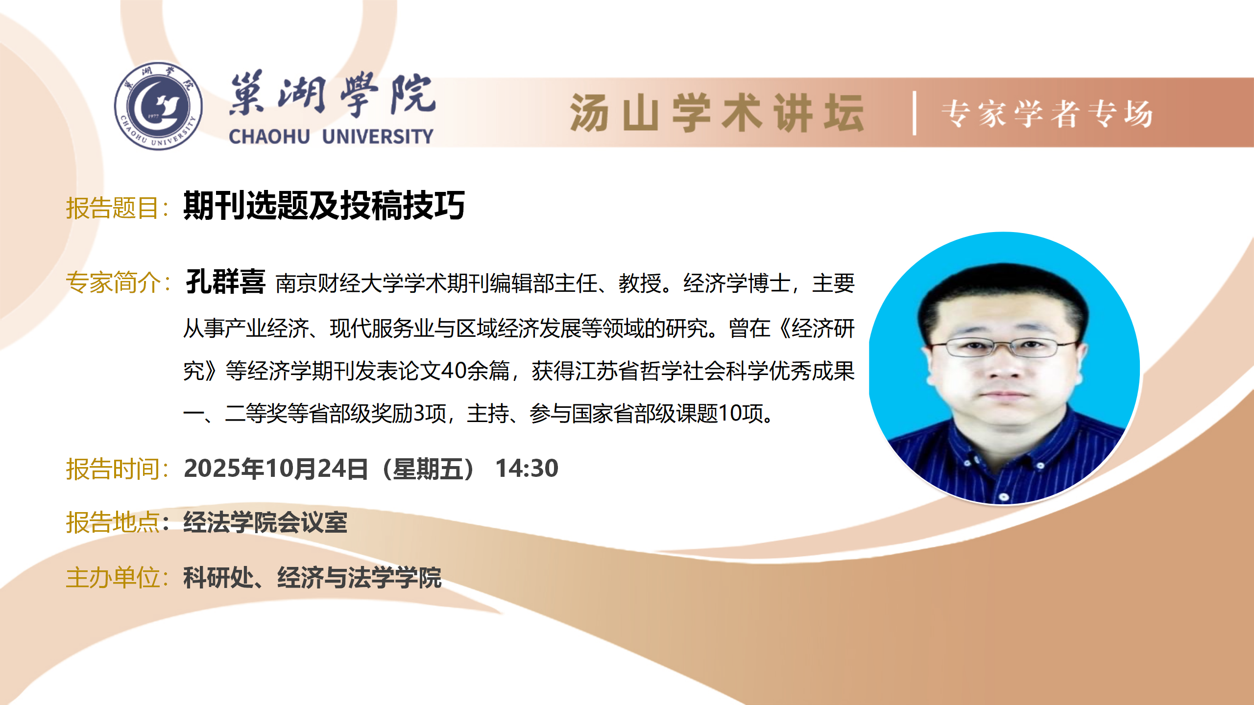 • 10月24日:南京財經大學學術期刊編輯部主任孔群喜教授講座